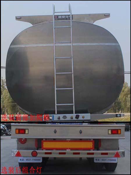 该车为非危险品运输车辆.罐体及车架材质材质为:铝合金,罐体总容量:43立方米,罐体有效容积:41.8立方米;,运输介质:润滑油,密度(千克/立方米):800,罐体外形尺寸为:长11400mm,宽2480mm,高(后端)为2150mm(罐体为鹅颈式,前端高度为:1990mm);车长/轴距/后悬的对应关系为:11900/5880+1310+1310,6030+1310+1310/1750,11750/5880+1310+1310,6030+1310+1310/1750;选装轮罩样式及铝合金轮毂,选择罐顶升降护栏,顶部可为挡水槽式也可以为走台式,选装爬梯的安装个数(一个或两个)和位置(前部或后部),工具箱左右位置及个数可选装,选装轻型行走机构,选装轻型行走机构时,整备质量为:6000Kg;ABS系统生产厂家:广州瑞立科密汽车电子股份有限公司,梁山顺安达汽车科技有限公司,山东梁山德尔福汽车科技有限公司,ABS型号:CM2XL-4S/2K(4S/2M),SAD-ABS4S/2M,DEF-ABS4S/3M;侧面及后下部防护装置材质均为:铝合金,侧后防护与车辆连接方式均为:螺栓连接,后部防护装置的主要尺寸参数:断面尺寸(mm):120×68,离地高度:500mm.